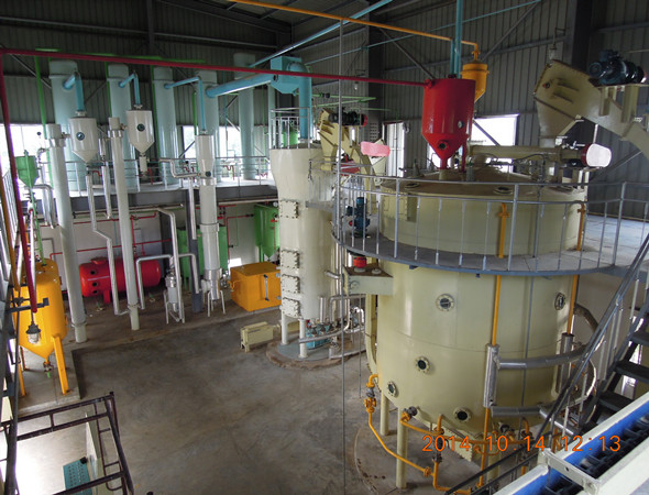 油脂浸出成套設備:浸出法制油是應用萃取的原理,利用溶劑油把油料中的油脂萃取出來,油脂溶解到溶劑油中,稱之為混合油,然后通過蒸發(fā)設備把溶劑油蒸發(fā),冷凝回收再利用,剩下的油脂就是毛油,被浸過的粕則利用刮板輸送機送到脫溶機烘干后輸送到粕庫。